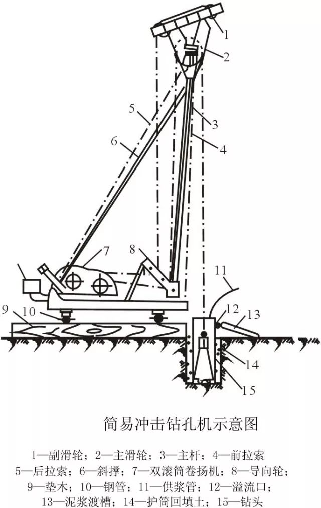 ③ 适用于松软土层(砂土、粘土)中冲孔,但遇到坚硬土层时宜换用冲击钻施工。