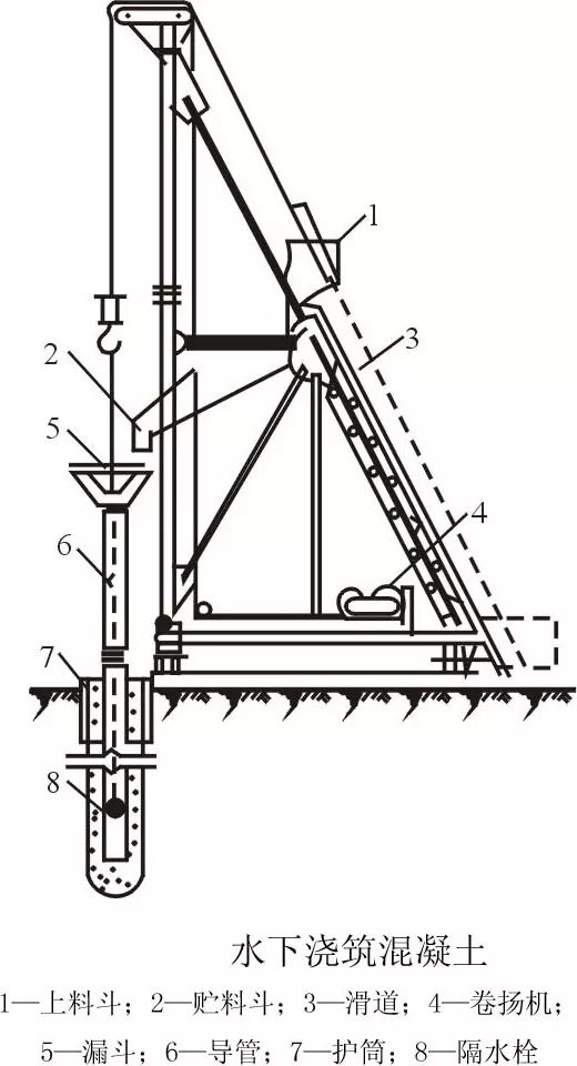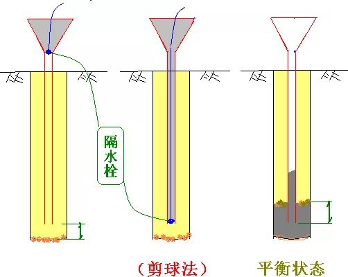 泥浆护壁成孔灌注混凝土的浇筑是在水中或泥浆中进行的,故称为浇筑水下混凝土。水下混凝土宜比设计强度提高一个强度等级,必须具备良好的和易性,配合比应通过试验确定。水下混凝土浇筑常用导管法。 浇筑时,先将导管内及漏斗灌满混凝土,其量保证导管下端一次埋入混凝土面以下1.0m以上,然后剪断(或迅速拔出)悬吊隔水栓的钢丝,混凝土拌和物在自重作用下迅速排出球塞进入水中。