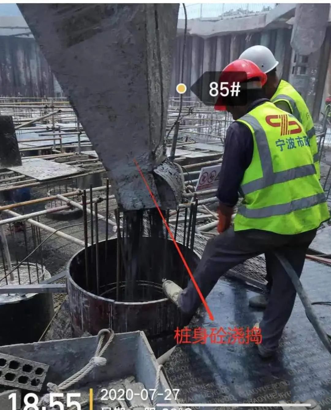 浇筑前施工员爬下去二次确认拍好照片留底签证,桩头进行界面处理使用高一等级混凝土删好后的原浆,使新旧混凝土完美结合,防止产生新的裂缝