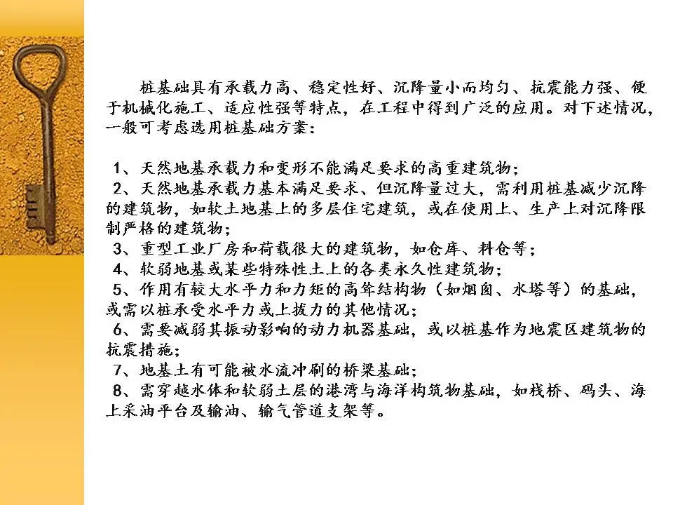 桩基础具有承载力高、稳定性好、沉降量小而均匀、抗震能力强、便于机械化施工、适应性强等特点,在工程中得到广泛的应用。