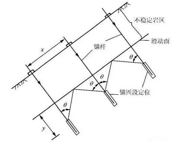 如果自由段长度过小或没有自由段,使得一部分锚固段处于滑裂面内主动区,在基坑开挖过程中,当坑壁在主动土压力作用下出现变形时,主动区内的锚固段将产生向基坑内方向的摩阻力,削弱了锚固效果,所以破坏面处的抗力是很小的或有限的。只有当锚杆锚固段离潜在破坏面足够的远,才能有效发挥锚杆的抗力作用和保证地层开挖面与滑裂面间有足够的压应力区。