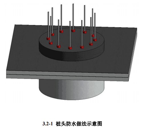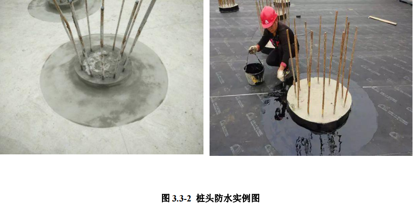 1.4 工艺方法:在桩顶设计标高以上 50mm 处弹出切割控制线,用切割机沿 控制线处切一圈,切割深度以距主筋 10mm 为宜。用冲击钻剥离出主筋,用风镐 破除桩芯混凝土,桩顶用錾子凿修平整。桩顶及四周涂刷水泥基防水材料,桩周 围垫层表面涂刷宽度不小于200mm,基础底板防水材料与桩周围接缝处用防水 油膏密封,桩主筋根部安装遇水膨胀止水圈。
