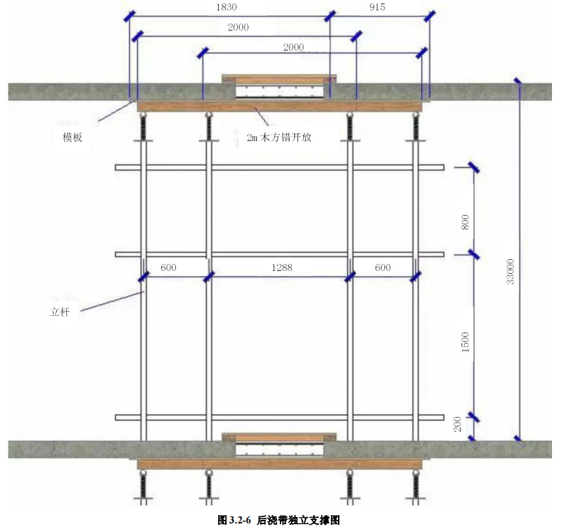3.4 工艺方法:后浇带模板支设必须采用独立设计系统,与满堂脚手架安拆 互不影响,且上下层立杆放置同轴心,后浇带砼未浇筑不得拆除;楼层通道应按 方案中明确位置预留架体开口,后浇带板面应作防护,并在实施过程中严格执行。现浇板后浇带模板上部侧口模板与钢筋位置锯槽吻合,安装牢固,上口两侧加设 木方,并用木模板整体封闭、保护,直到砼浇筑时打开。地下室顶板后浇带两侧 砼浇筑后加设挡水台并用模板进行封闭,避免杂物掉入。
