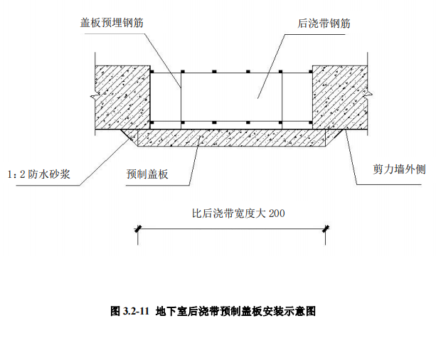 5.3 工序:盖板预制→后浇带处理→盖板安装→抹面→防水→回填。5.4 工艺方法:地下室剪力墙后浇带可采用预制盖板封堵、提早回填的方法 进行施工,封堵盖板比后浇带宽不小于 200mm,厚度应具有防水及抗回填土侧 压力的能力。安装前后浇带周边接触处应清理干净,根部防水卷材应进行保护。找平后人工或电葫芦吊装安装第一块盖板,盖板预埋钢筋应与后浇带钢筋焊接牢 固,盖板与基层及相互间坐浆饱满,依次安装预制盖板至剪力墙顶部。盖板表面 采用防水砂浆抹压密实平整。防水附加层施工完大面积进行防水层施工。防水满 足要求后进行基坑周边回填土施工。