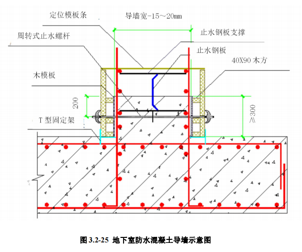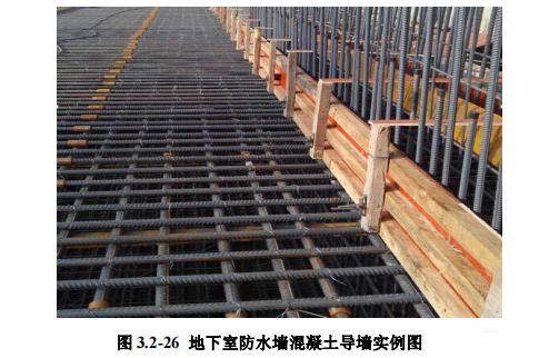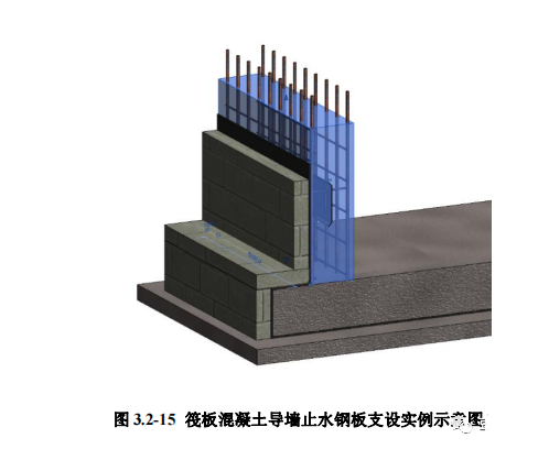6.4 工艺方法:筏板导墙钢筋绑扎完成后,安装止水钢板,止水钢板槽口朝 向迎水面,止水钢板拼接缝及止水钢板与钢筋应焊接严密牢固。导墙模板应支设 在坚实的基础上,采用防水穿墙螺栓及钢管固定。导墙混凝土浇筑时不得触碰止 水钢板及导墙模板,不得留有施工冷缝。上层混凝土浇筑前应清理干净导墙顶部 浮浆,并按规定铺设同强度减石子浆,确保接茬严密。导墙以上混凝土施工时, 导墙模板不应拆除,作为上部模板的支设基础并确保上部模板支设牢固,防止接 缝漏浆及不严密现象。