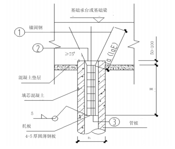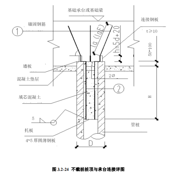9.4 工艺方法:桩顶内应设置托板及放入钢筋骨架,桩顶填芯混凝土采用与 承台或基础梁相同混凝土强度等级。浇灌填芯混凝土前,应先将管桩内壁浮浆清 理干净,宜采用内壁涂刷水泥净浆、混凝土界面剂,浇筑混凝土采用微膨胀混凝 土等措施,以提高填芯混凝土与管桩桩身混凝土的整体性,伸入承台的锚固筋及 架立筋应沿管桩圆周均匀布置,且与托板焊牢,托板尺寸略小于管桩内径。管桩 填芯混凝土高度当为承压桩时不应小于 3D,且不小于 1.5m,当为抗拔桩时应按 公式进行计算,且不小于 3m。