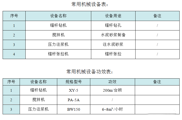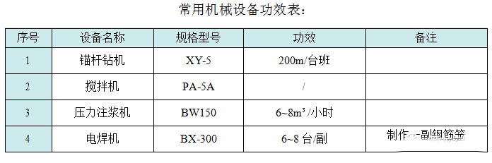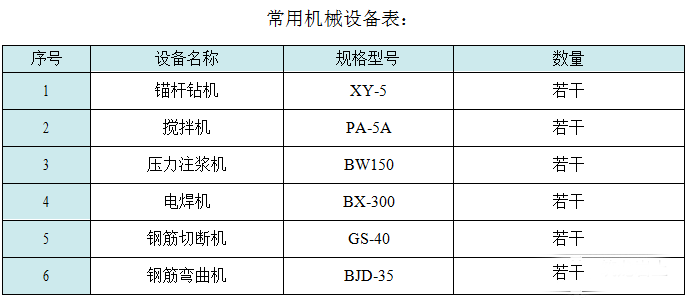 根据设计要求选择合适的机械设备,设备工作性能良,设备数量应根据施工部署及工期要求进行配置。