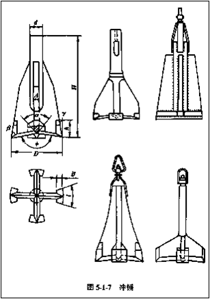 冲击式钻机能适应各种不同地质情况,特别是卵石层中钻孔,冲击式钻机较之其它型式钻机适应性强。同时,用冲击式钻机成孔,孔壁四周形成一层密实的土层,对稳定孔壁,提高桩基承载能力,均有一定作用。冲锤(如图所示)有各种形状,但它们的冲刃大多是十字形的。