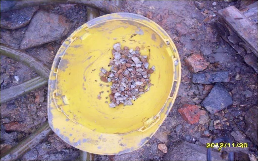 3、定界面、终孔验收。在钻进过程中对照岩土工程勘察报告,进入中风化凝灰岩时施工单位技术员要查看岩样,自查符合要求后再上报监理、甲方定界面,验终孔。验收时从捞取的钻渣中取出样品,查明岩样并填写岩层深度、取样时间等标签,标签填写好后装袋保留。