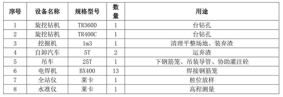 根据钻孔桩工程数量和地质条件,进行旋挖钻机成桩工艺性试验,合理选择旋挖钻机型号和主要设备参数,同时,根据施工进度安排配备合适的设备数量,具体见表6.1。