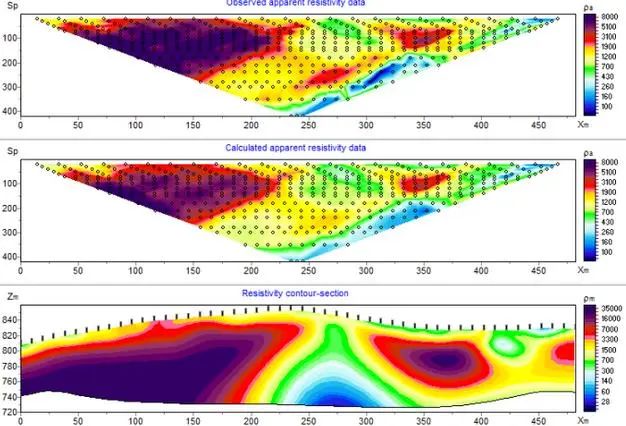 数据处理采用Res2dinv软件,按照数据编辑一地形校正一初始设置一正演设置一反演设置一反演结果输岀一Surfer成图的处理流程进行。