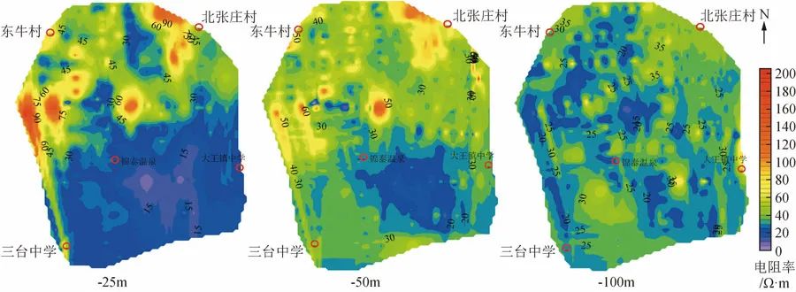 通过对测区0-200m深度反演的电阻率值进行三维建模,得到水平向为主、任意向为辅的电阻率深度切片(如图2),认为:在-65m以上深度,电阻率值范围为5〜70Q・m,高值较多。推测有大层段含水的细、中砂,即存在多个连续互通的大型“砂层透镜体”;而-65m以下深度,电阻率值范围为10〜50Q・m,高值减少,推测粘土、亚粘土、亚砂土与粉细砂、粉砂等频繁交互沉积,形成不等厚互层。