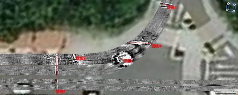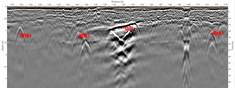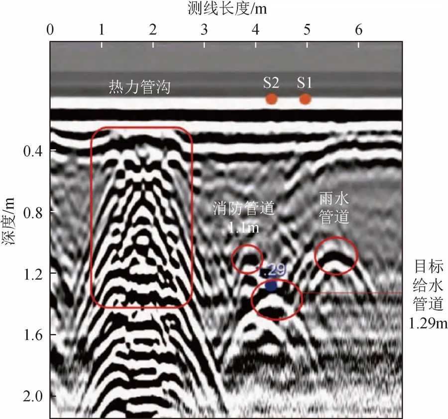 邓诗凡等(2020)综合应用电磁感应法、地质雷达法、声学探测法开展地下管线分布探测试验,通过不同方法相互配合和交叉验证,绘制了准确的管网分布图。图3雷达图像揭示了雨水管道、消防管道、热力管沟及给水管道。结果表明,组合使用合适的探测方法,分步试验判断,可有效解决近距离铸铁管线探测中的信号干扰问题。