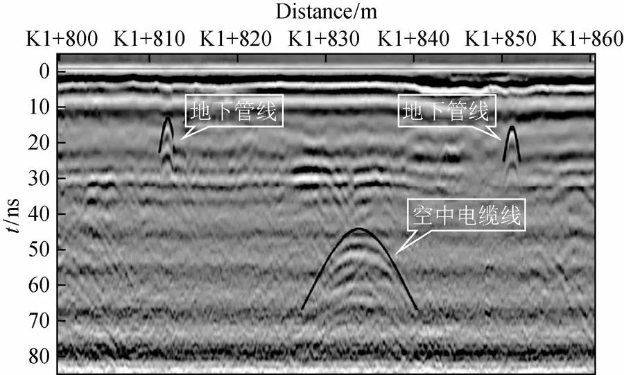 //图4 空中电缆线和地下管线探地雷达波组特征