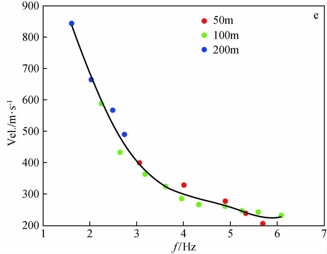 李洪丽(2020)通过短周期地震仪连续记录15小时地震背景噪声数据(三重圆形采集台阵如图6所示),采用微动空间自相关法(SPAC),对50m、100m和200m台阵孔径大小对应频散低频部分相速度进行了测试,通过拟合提取岀观测点瑞雷面波频散曲线(图7),并利用面波层析法反演得到该区域S波速度结构剖面。通过剖面上两个低速异常带划分富含水区(图8),为地热探测研究提供了参考。