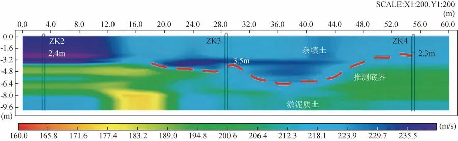 随着城市发展,地表河浜因碎石、黏土及垃圾等填埋而形成暗浜,属不良工程地质现象,需消除地质隐患。翟法智等(2017)针对宁波轨道交通暗浜勘查问题,分别研究了微动剖面探测法、瞬态瑞雷波法及高密度电法三种物探方法探测暗浜的有效性,三种方法推测的暗浜位置及埋深较一致。图9为1线微动探测视S波速度剖面及推测范围,图10标示2线瞬态瑞雷波视速度图及解释区域。