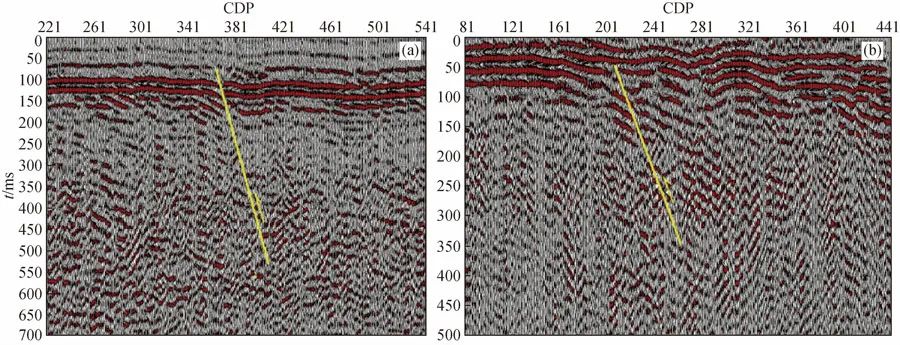 // 图11 (a)3m道距获得的中浅部地震剖面;(b)1m道距获得的浅部地震剖面据杨歧焱等