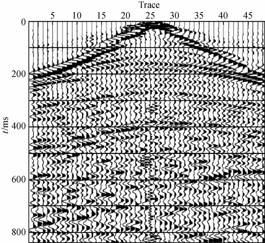 横波反射地震利用震源激发横波,并进行资料处理、解释。地震横波不受含水饱和度的影响,探测精度高,一定程度可弥补纵波反射在浅层勘探的不足。陈相府和安西峰(2007)采用重锤水平锤击铁板正反两个方向激发,利用Summit数字地震仪和28Hz横波检波器接收,经3次垂直叠加,得到较为理想的单炮记录(如图12),并依据地质解释和波速测井对地层层面进行了划分(如图13)。分析表明多数岩土层与反射界面对应关系较好,体现了横波勘探在第四纪松散层层序划分及厚度探测中的优势,较好弥补了纵波浅层勘探的不足。
