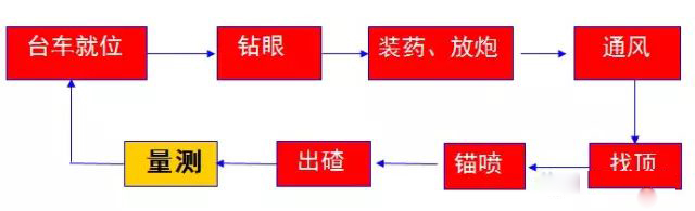 (1)开挖上半断面:钻眼-装药-爆破-锚喷-推石碴到下半断面;
