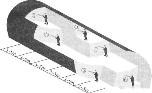 施工要求:各部开挖时,周边轮廓尽量圆顺,减小应力集中;各部底部高程应与钢架接头一致;每部开挖高度约为3.5m;后一侧开挖应全断面及时封闭;左右两侧纵向间距一般为30-50m;中隔壁应为弧形或圆弧形。
