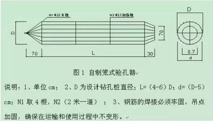 f.钻孔达到设计深度时,要对孔深、孔径、孔位和倾斜度进行检查,检查结果要符合下表要求,并监理工程师确认后,方可确认终孔,量测孔深并记录。孔深采用标准测绳量测。孔位采用全站仪精密测量校对。孔径采用自制笼式验孔器(验孔器的尺寸见下图)检验。