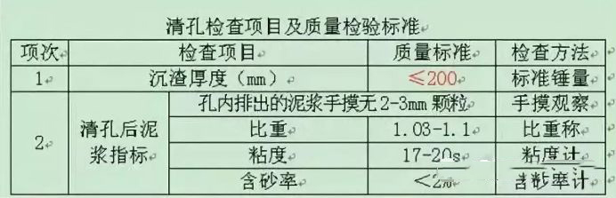 a.清孔的要求 根据本桥段的钻孔方法、机具设备条件和地层情况决定,先用泥浆泵接钻杆进行一次清孔。量测孔深和泥浆指标,清孔直到沉渣厚度和泥浆指标符合下表要求时结束。