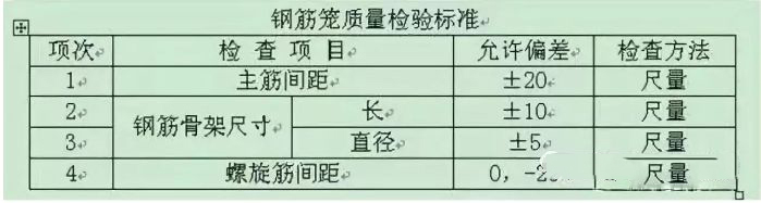 a.钢筋笼制作与声测管安设 根据钢筋笼的设计直径、间距、长度和数量计算主筋分段长度和箍筋下料长度。将所需钢筋调直后,按计算长度切割备用。钢筋笼骨架在钢筋加工厂统一制作,硬化场地,保证主筋平放在同一水平面上,确保钢筋笼骨架的竖直度。主筋与加强箍筋采用点焊连接,主筋与螺旋箍筋采用扎丝绑扎。钢筋笼的制作和焊接要符合下表的要求。