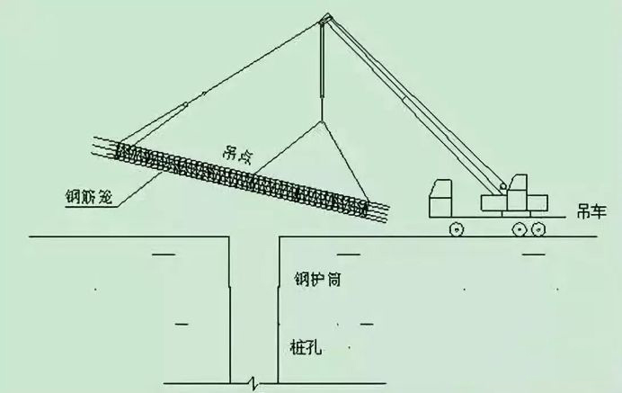 ②.钢筋笼吊装时,由25t吊车分节吊装,分节处采用单面搭接焊。在安装钢筋笼时采用三点起吊。第一吊点设在骨架的下部;第二吊点设在骨架长度的中点到三分之一点之间;第三吊点设在钢筋骨架最上端的定位处。应采取措施对起吊点处予以加强,以保证钢筋笼在起吊时稳固不变形钢筋笼吊装见图1。