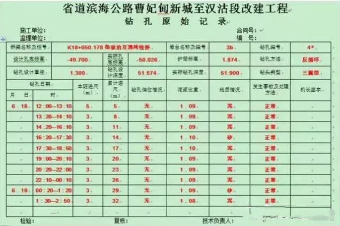 c.钻孔作业应分班连续进行,填写钻孔原始记录,交接班时应交待钻进情况及下一班应注意事项。应经常对钻孔泥浆进行检测和试验,不合要求时,应随时改正。应经常注意地层变化,在地层变化处均应捞取渣样,判明后记入记录表中并与地质剖面图核对。发现与设计不符时及时向现场工程师和监理工程师汇报,以待处理。