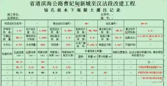 灌注过程中对每车混凝土做坍落度试验,对不满足技术规范、设计要求的混凝土严禁灌入导管内。每车混凝土灌注完毕后,有专人负责量测混凝土面距导管顶的距离,计算导管埋深,确定拆卸导管的长度,使导管埋深始终符合规范设计要求。并做好混凝土灌注记录。如发现混凝土灌注方量与混凝土顶面不相符时,应及时分析原因,找出问题所在,及时处理。在灌注过程中,注意保持孔内水头,以防孔内水压力不足而造成坍孔。