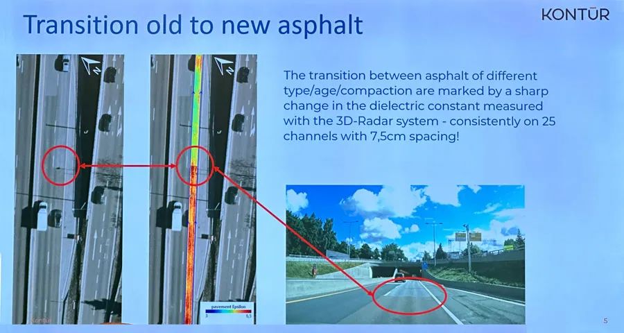 在具有7.5cm间距的25个通道上,用3D雷达系统测量的介电常数急剧变化可以展现不同类型/年龄/压实度的沥青路面过渡。