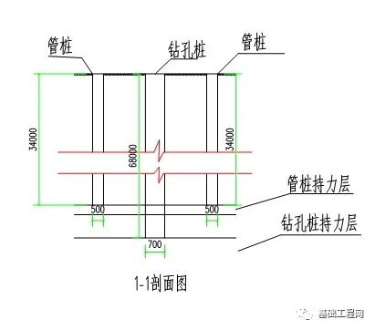 布桩特点:主楼桩基采用的直径ф700/600长68米的钻孔桩和直径ф500长36米的预应力管桩,其中钻孔桩沿纵轴线方向布置,管桩沿横轴线布置。