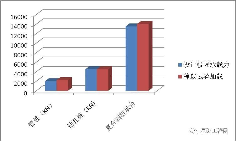 经静载试验,管桩设计极限承载力2000kN,试验加载达2217.6kN;钻孔桩设计极限承载力4500kN,试验加载大于4500kN。2根钻孔桩和2根管桩的复合4桩承台设计极限承载力13500kN,试验加载大于14010kN。均符合或超过原设计极限承载力要求,并满足规范沉降量规定。