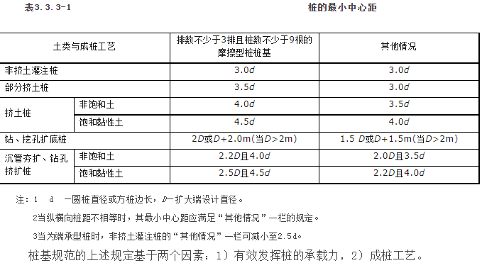 1、基桩的最小中心距应符合表3.3.3-1 的规定;当施工中采取减小挤土效应的可靠措施时,可根据当地经验适当减小。
