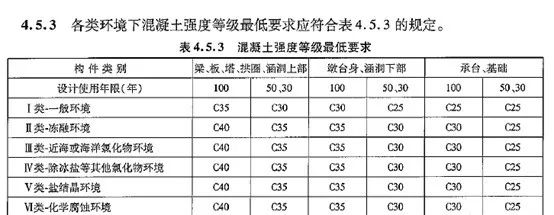 1 《公路钢筋混凝土及预应力混凝土桥涵设计规范》(JTG 3362-2018)(2018年11月01日实施)第3.1.2条,当采用强度标准值400MPa及以上钢筋时,不低于C30;第4.5.3条,环境类别Ⅰ类-一般环境,桥梁主体结构设计使用年限100年,混凝土强度等级最低要求:桥墩C30,桩基C25。