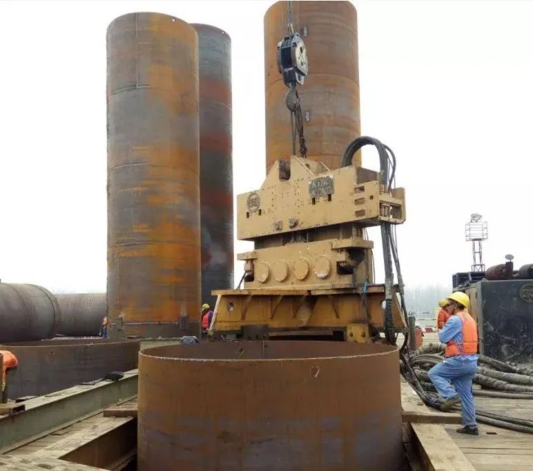 4.3履带吊配合振动锤进行钢护筒沉放。振拔锤对钢护筒振入时,先采用自重下沉,在确保钢护筒的位置准确,桩身有足够的稳定性后,再采用振动下沉。