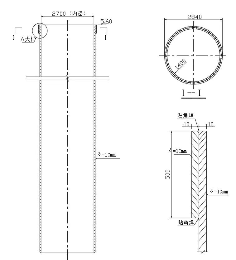 吊耳采用厚度为25mm的Q235钢板,底板尺寸为竖向20cm×环向15cm,耳板尺寸为径向20cm,环向10cm(耳宽),孔径为5cm。
