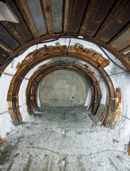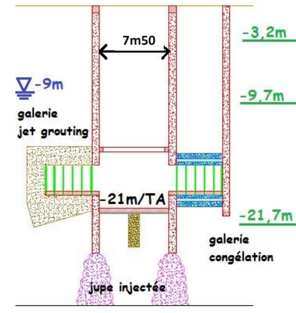 试验竖井由厚约80cm、内径约7m、深约25m的地下连续墙结构组成。在深度21m处,Beauchamp砂层中分别开挖了两条直径3m、长约5m的通道,其中一条采用高压旋喷,另一条则采用人工冻结。