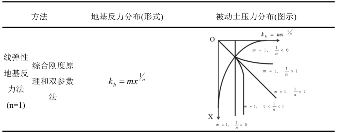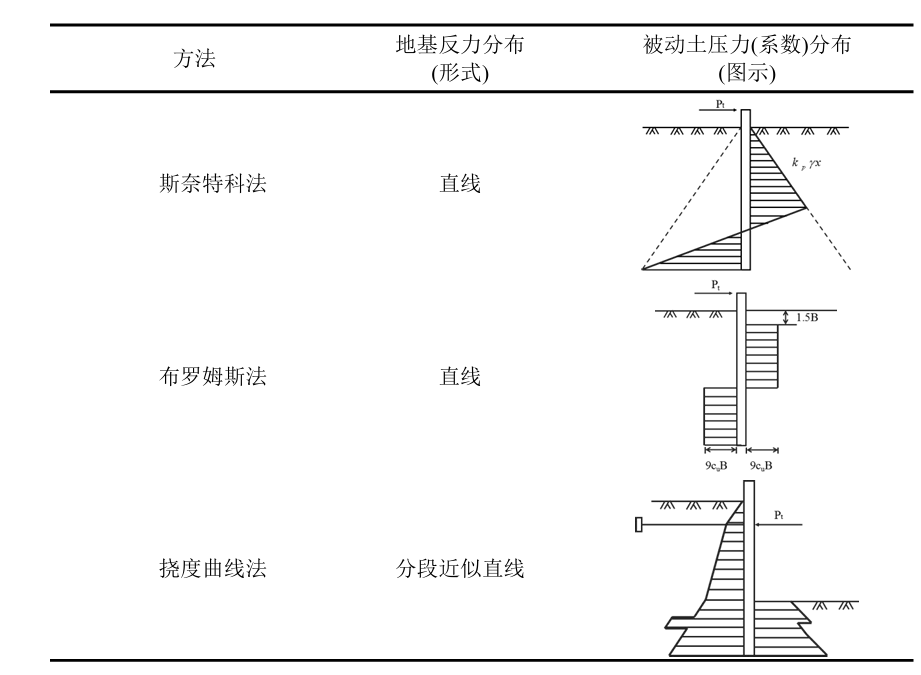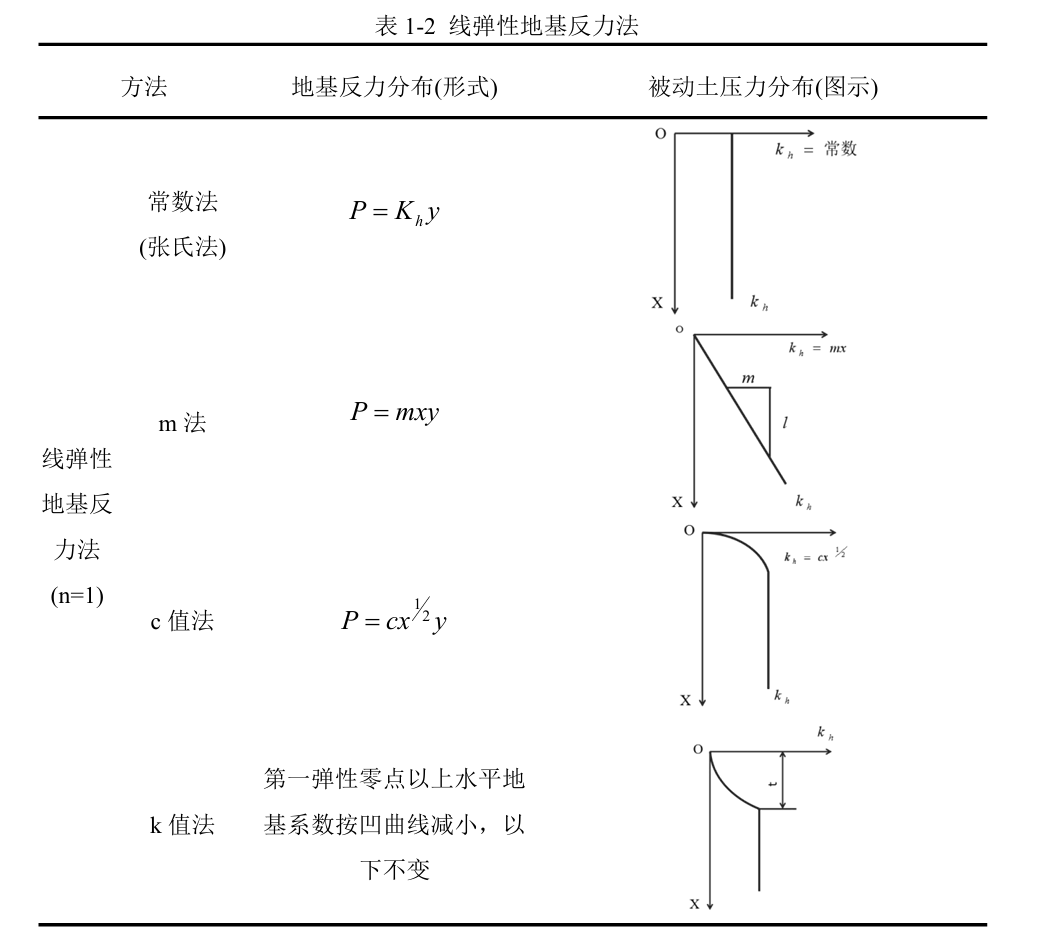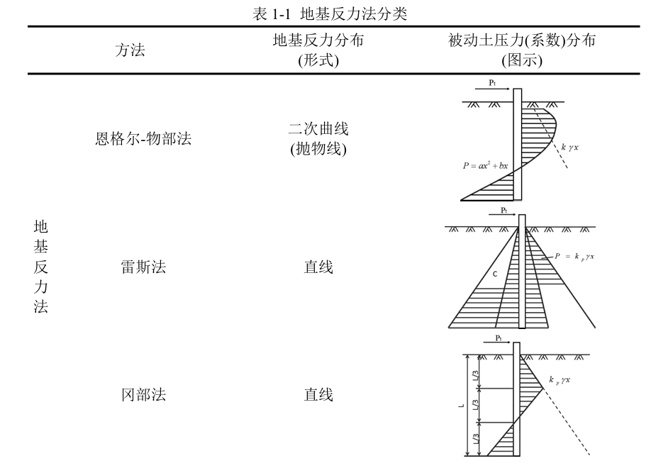 (3)土反力任意分布的方法,如挠度曲线法。上述几种方法的地基反力分布形式和被动土压力(系数)的分布情况如表1-1所示