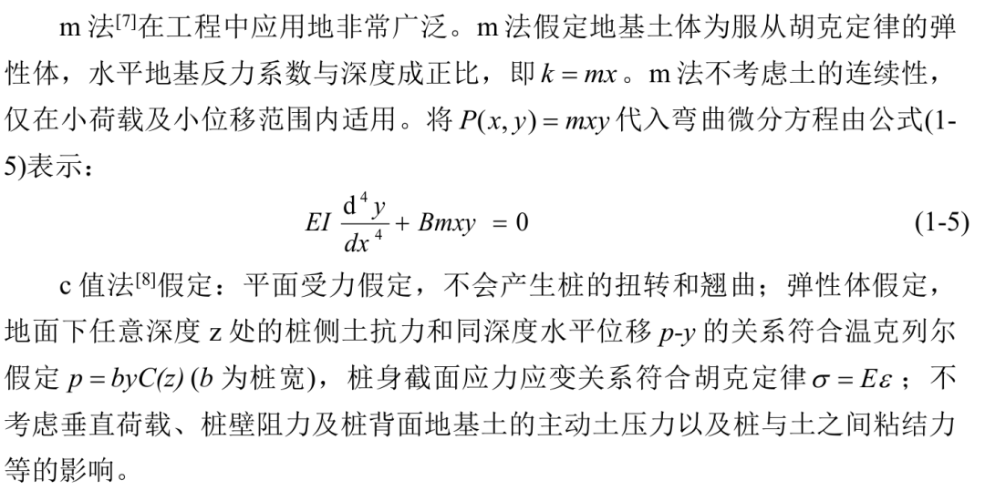 若弹性地基反力法按y的指数n来分类,通常分为n=1时的线弹性地基反力法和n≠1时的非线弹性地基反力法。目前一般规定水平荷载作用下单桩允许水平位移约为6~10mm,当水平位移在允许位移范围内时,桩侧土抗力和桩身水平位移可以近似认为呈线性增加。小位移使用线弹性地基反力法,反之则使用非线弹性地基反力法。
