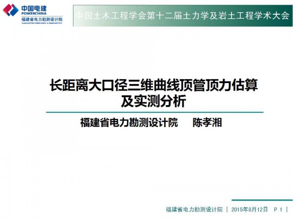 第十二届全国土力学及岩土工程学术大会PPT系列——长距离大口径三维曲线顶管顶力估算及实测分析
